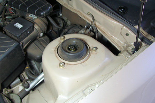 This is the large nut in the centre of the strut top, hidden underneath a dust cover.